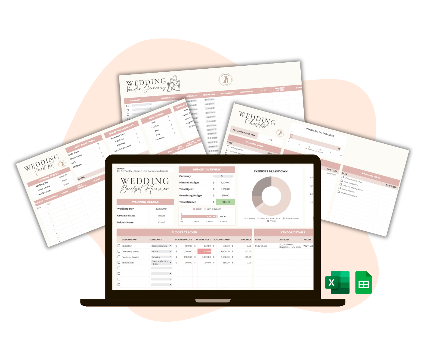 - 8 Spreadsheets: Budget Planner, Guest List, Seating Chart, Checklist, and more.